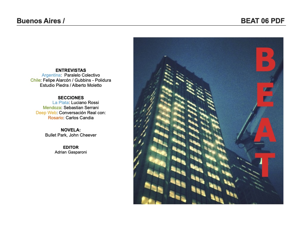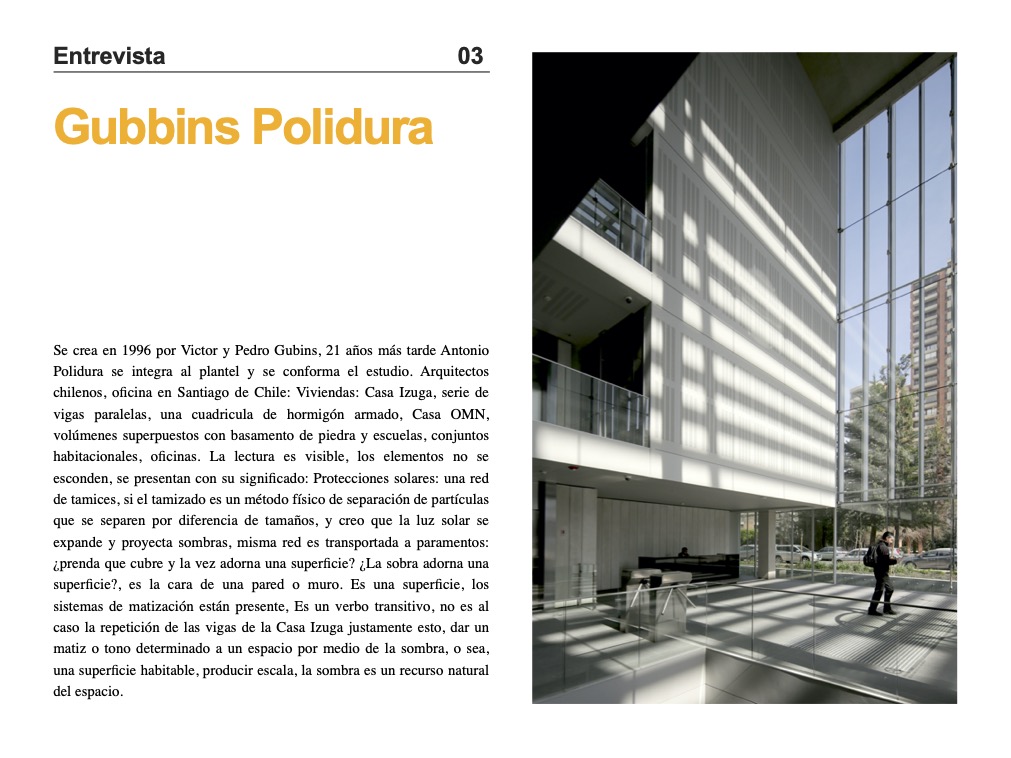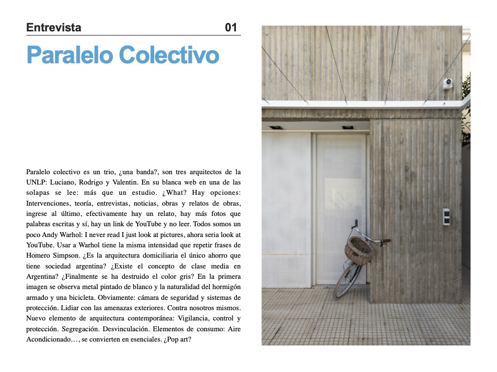 Entrevistas con Paralelo colectivo / Felipe Alarcón / gubbins Polidura / Alberto Moletto / Estudio Piedras. Textos enviados por: Luciano Rossi / Sebastian Serrani / Carlos Candia.