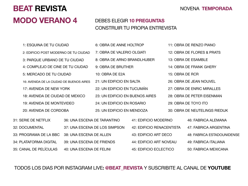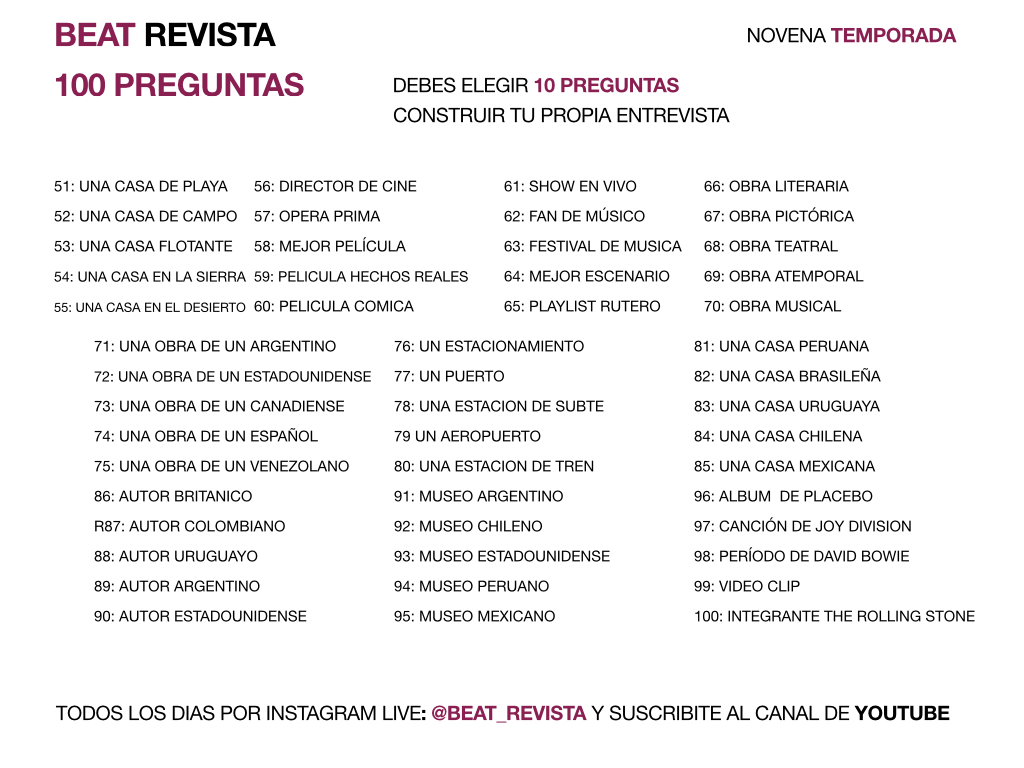 Todos los días a las 17 horas, horario Buenos Aires, realizo entrevistas…, 10 preguntas, la metodología es: EnvÍo 100 preguntas y deben elegir 10 a responder
