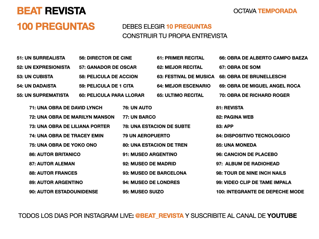 Todos los días a las 17 horas, horario Buenos Aires, realizo entrevistas…, 10 preguntas, la metodología es: EnvÍo 100 preguntas y deben elegir 10 a responder